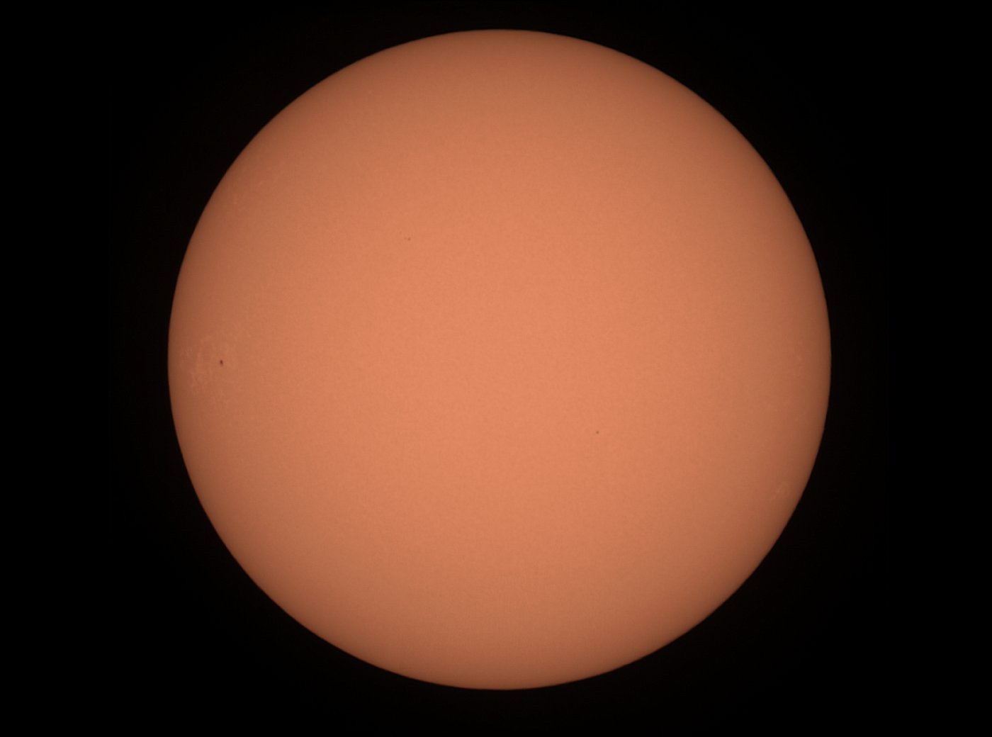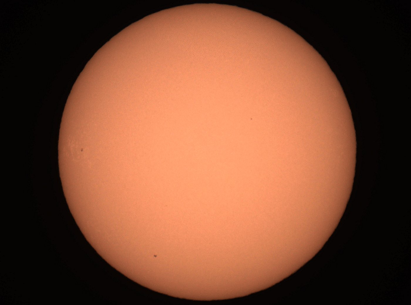Sonne vom 19.12.2025 mit ISS Durchflug 10:35 Uhr Maksutov-Teleskop 1300 mm CCD Kamera veTec 16000C 1 Bild