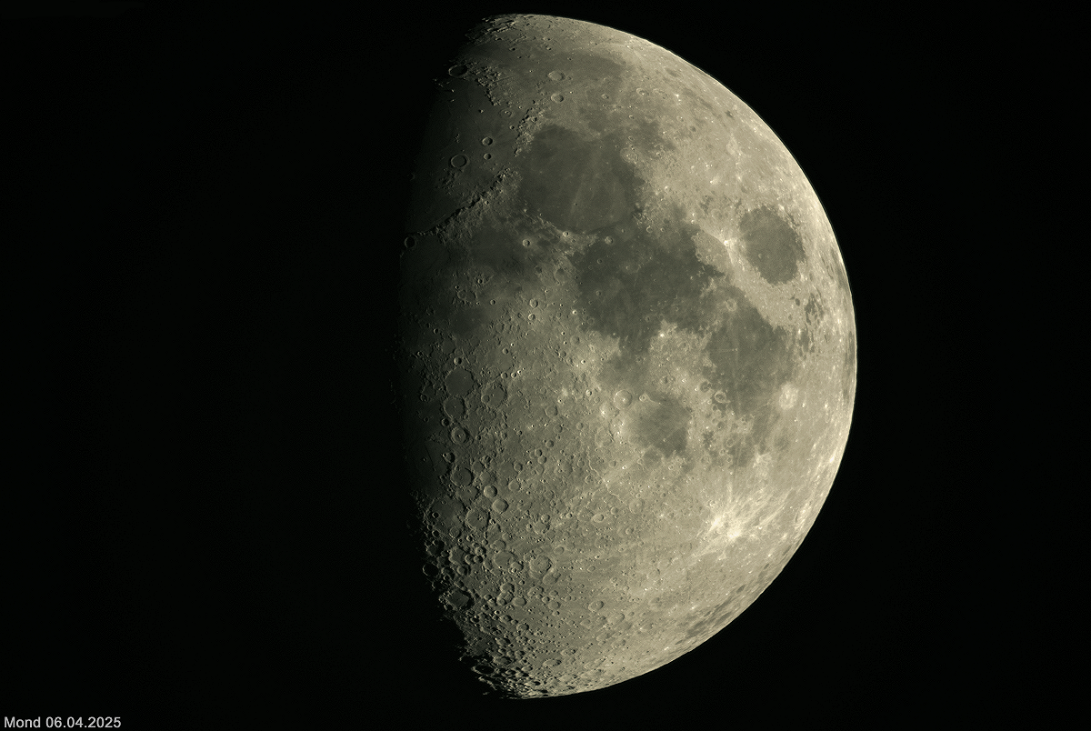 Zunehmender Mond vom 06.04.2025 mit RC-Teleskop 1600mm, Omegon veTec 571c Kamera aufgenommen