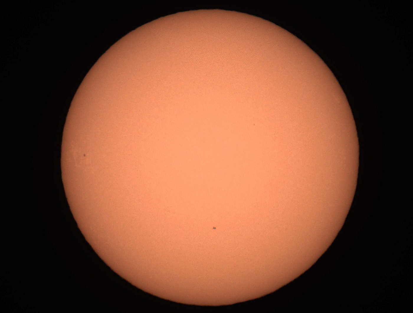 Sonne vom 19.12.2025 mit ISS Durchflug 10:35 Uhr Maksutov-Teleskop 1300 mm CCD Kamera veTec 16000C 1 Bild